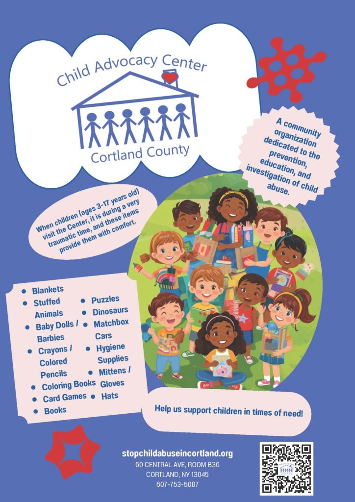 During this time of giving we partnered with the Child Advocacy Center of Cortland County to help them with items they need for the children they serve. Visiting their Center can be traumatic for children so the following items can bring comfort (new is preferred):
